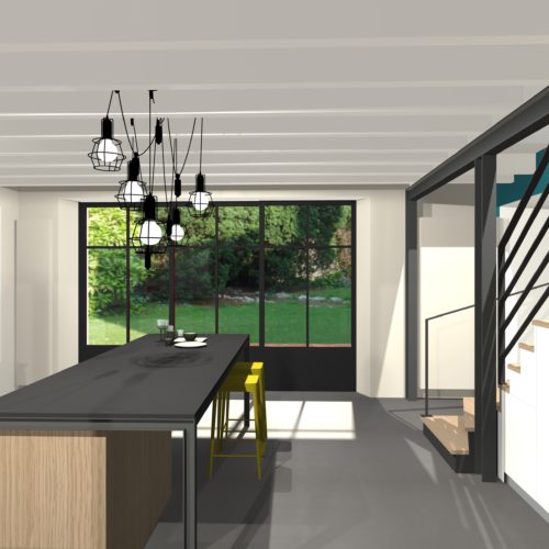 Supprimer la cuisine vieillotte, obtenir une circulation plus fluide vers la pièce vitrée attenante, optimiser la lumière naturelle dans cette vieille bâtisse et créer une vraie chambre au rdc ainsi qu’une lingerie digne de ce nom, telles étaient les doléances principales de ce maitre d’ouvrage. Le travail d’esquisses, une fois validé, a permis de repenser les circulations horizontales, de pousser les limites de la cuisine, véritable cœur de cette habitation, en abattant notamment l’une des parois de la cage d’escalier. Celui-ci, refait à neuf, participe à présent pleinement à l’ambiance contemporaine de cette cuisine et l’espace sous celui-ci a été mis à profit pour y loger le frigo américain et d’autres équipements profonds. Les jeux de poutres métalliques nécessaires au soutènement des planchers de l’étage ont volontairement été laissés apparents, le bleu turquoise du pan de mur structurant l’escalier a permis de donner une touche tonique à ce projet ou la lumière entre maintenant à flots par la grande baie ouverte pour l’occasion.